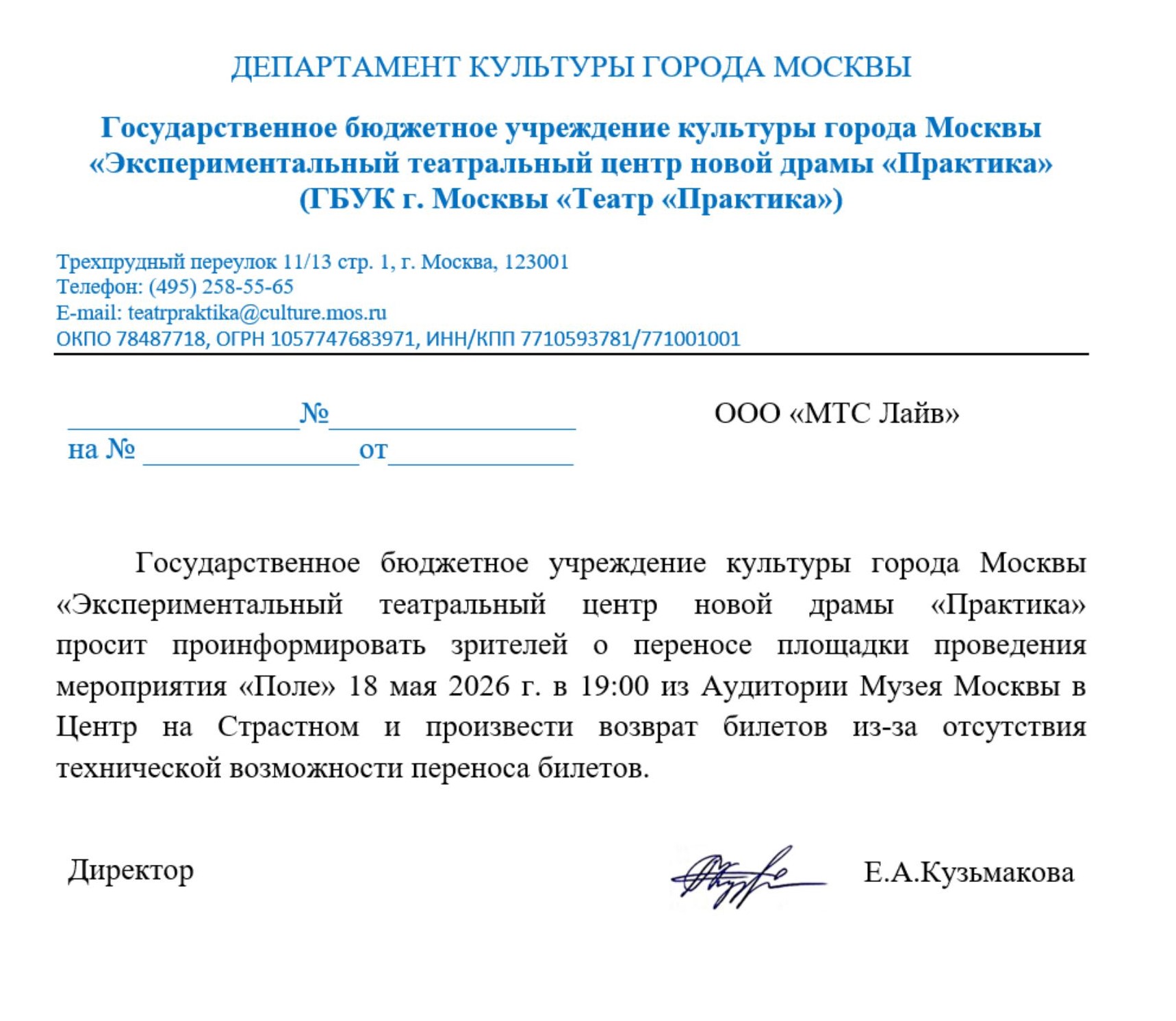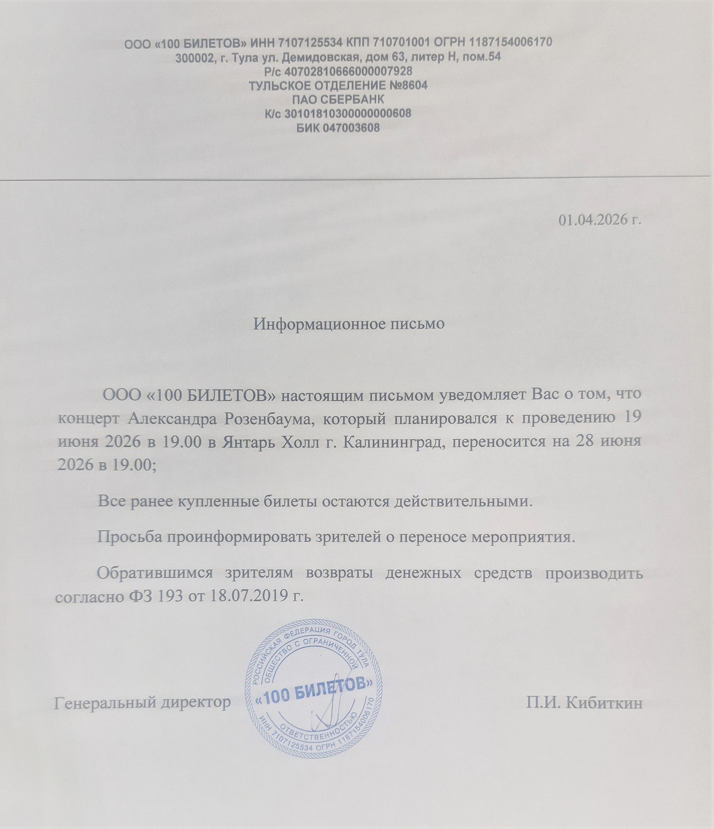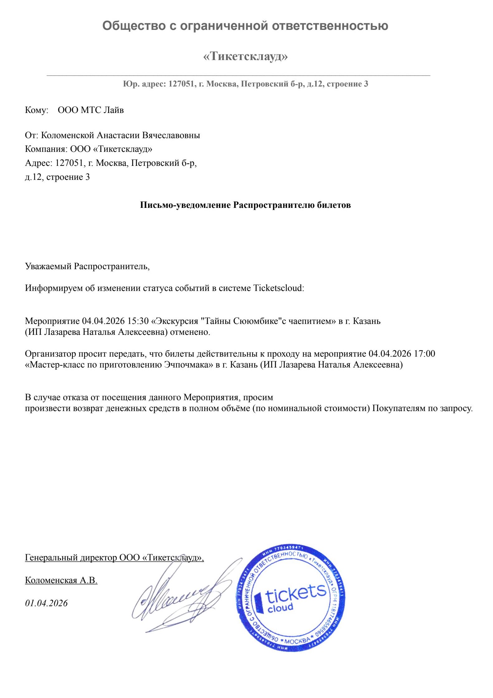 О новой дате мероприятия и об условиях возврата будет направлено дополнительно.