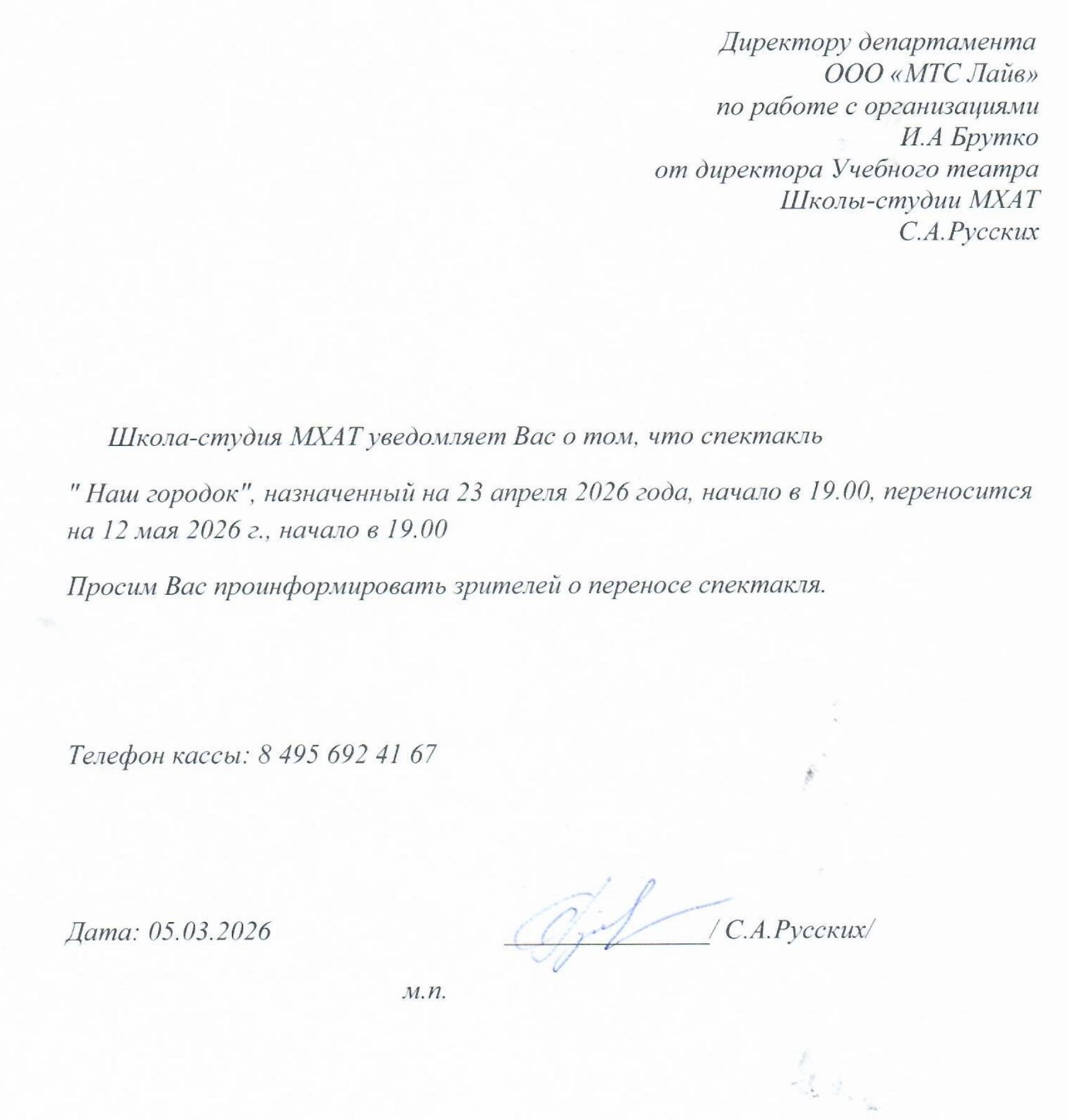 Спешим сообщить, что по информации, полученной от организатора, спектакль «Наш городок», запланированный на 23 апреля 2026 года в 19:00 в Учебном театре Школы-студии МХАТ, перенесён на 12 мая 2026 года, начало в 19:00.